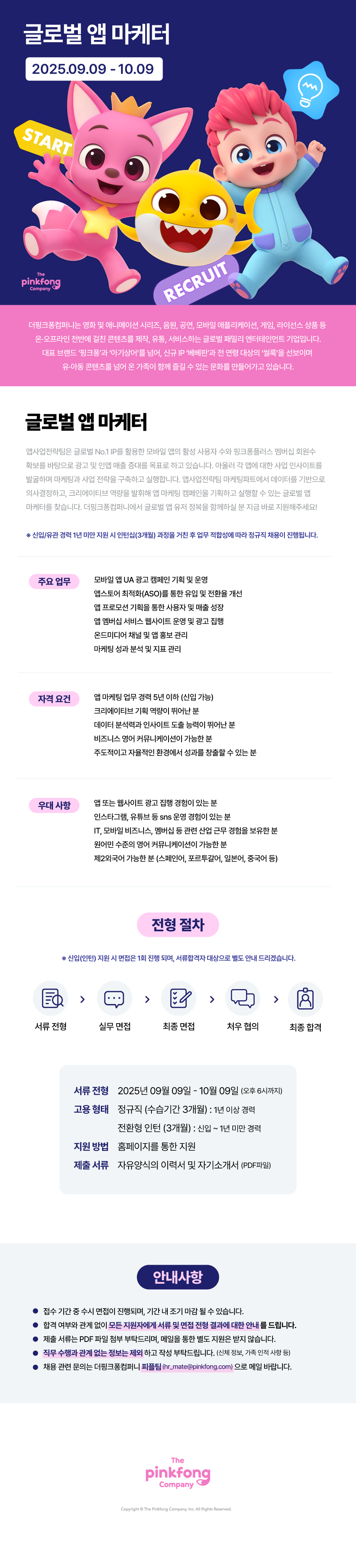 더핑크퐁컴퍼니(주)에서 채용공고가 시작되면 이메일로 알려드립니다.