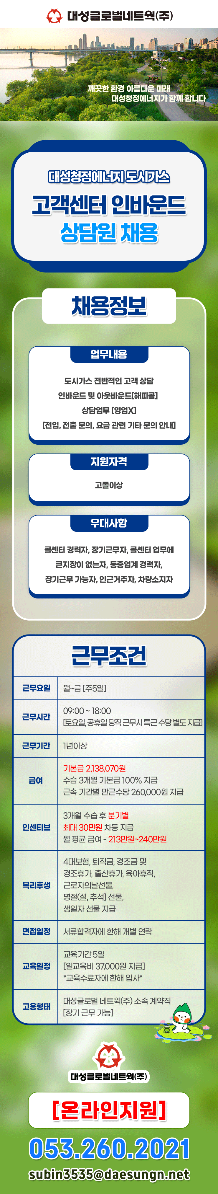 대성글로벌네트웍(주)에서 채용공고가 시작되면 이메일로 알려드립니다.