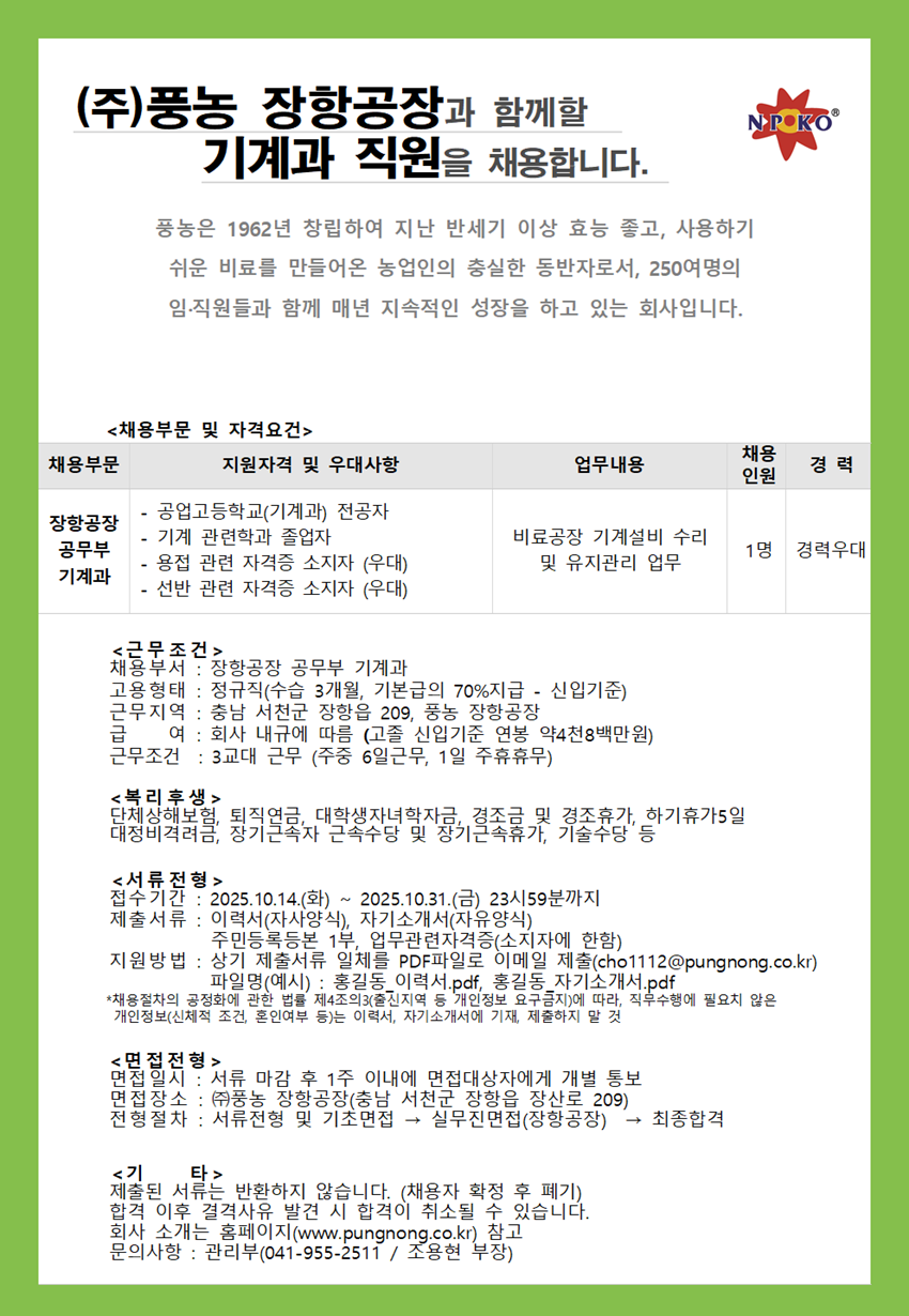(주)풍농에서 채용공고가 시작되면 이메일로 알려드립니다.