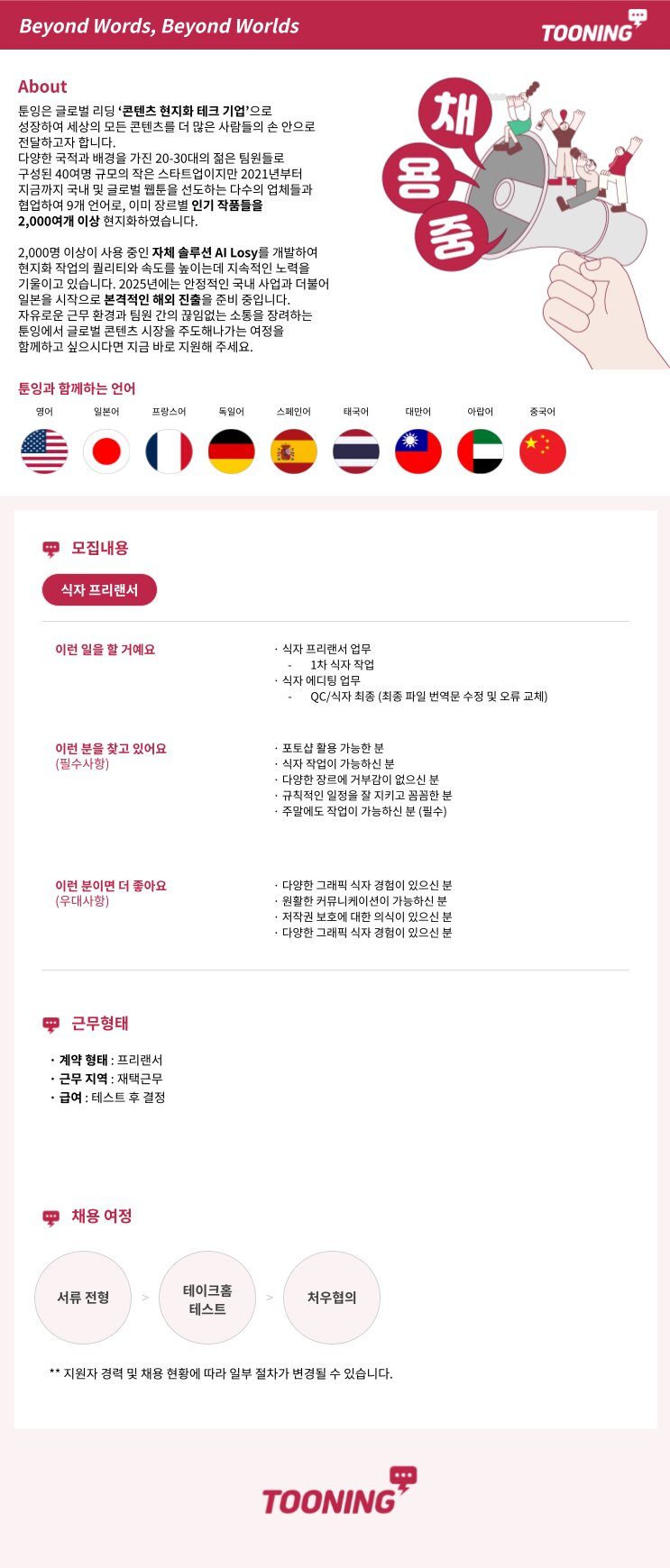 (주)툰잉에서 채용공고가 시작되면 이메일로 알려드립니다.