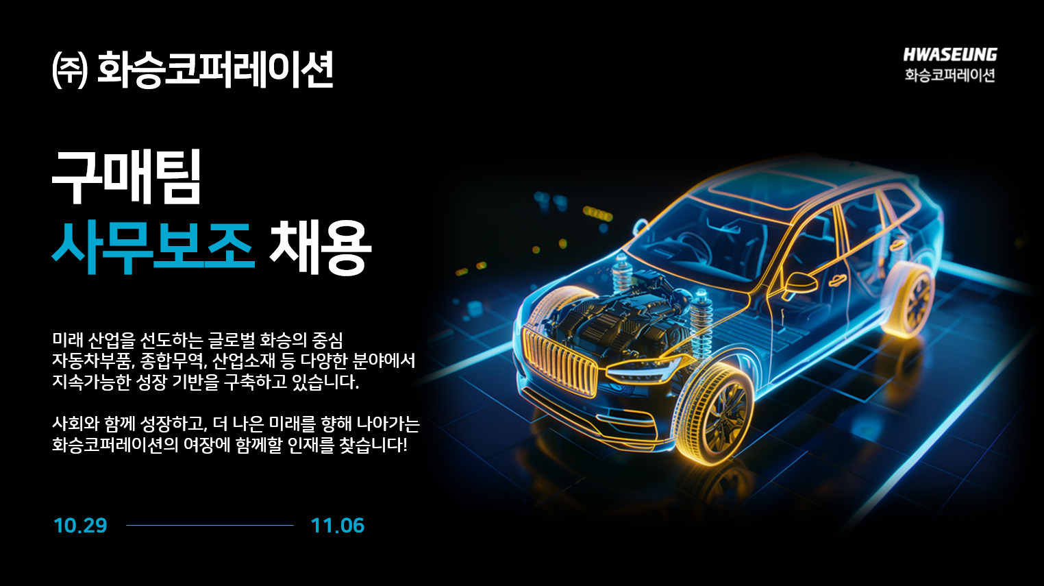 | 화승코퍼레이션 구매팀 사무보조 채용 안내 | | | #화승코퍼레이션 | | | 모집 분야 | 직무내용 | 자격요건 및 우대사항 | 근무지 |
