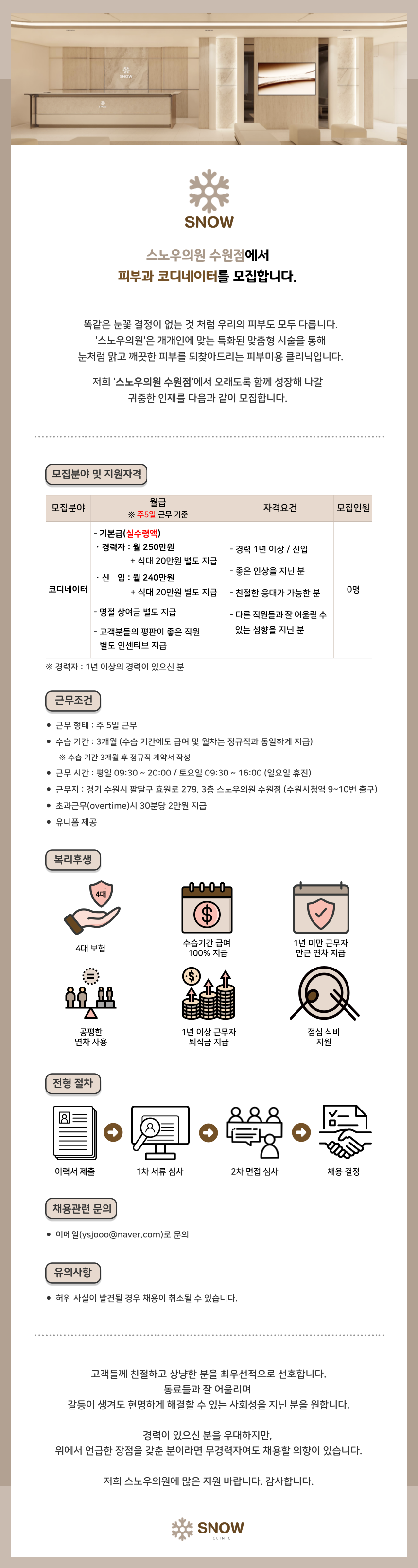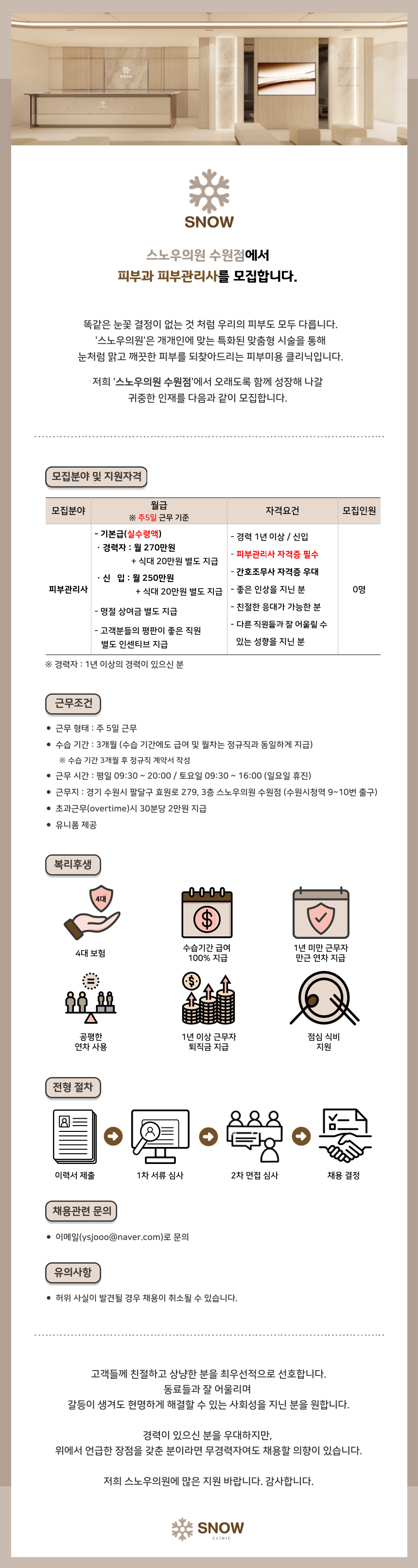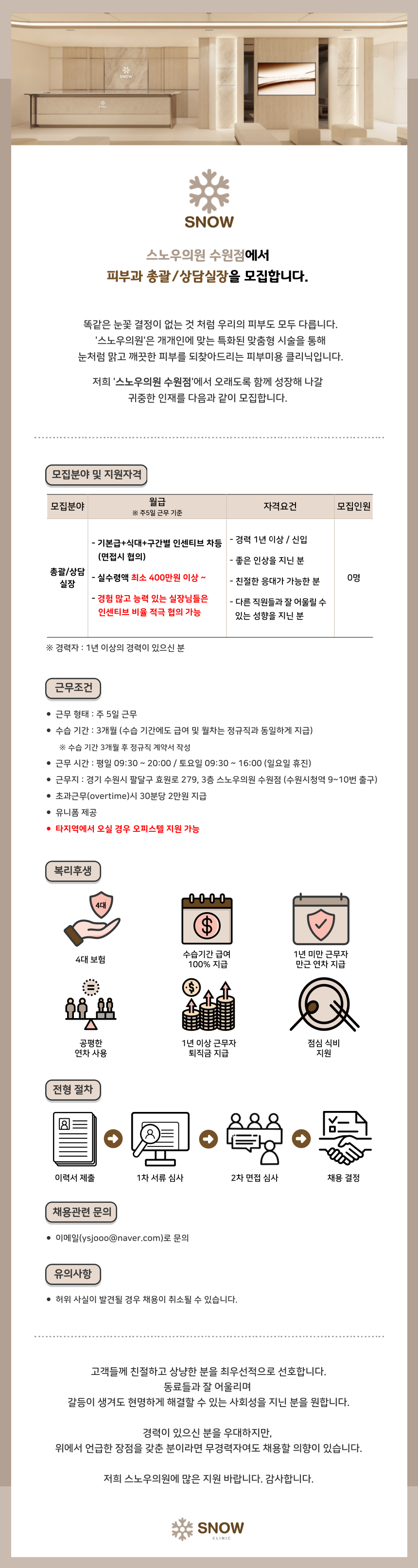 NEW스노우의원 수원점 실장, 코디, 간호, 피부 모집합니다